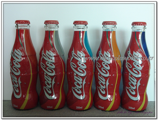 5개의 각기 다른 디자인이 코카콜라 전통의 컨투어 병위에 랩핑되어 있으며, 각 병마다 따로 부채꼴 모양의 박스에 포장되어 있어 모두 합치면 원통의 모양이 됩니다.