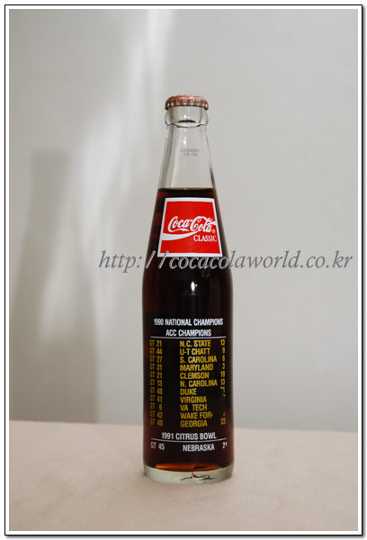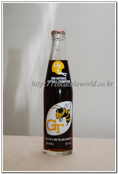 10 온스짜리 1990년 National Football Championship 우승팀 Georgia Tech Yellow Jackets 기념 코카콜라 병입니다. 한쪽 면에는 병목 부분에 코카콜라 로고와 시즌 Georgia Tech의 게임 전적이, 다른 면에는 Georgia Tech 미식축구팀 헬멧 디자인과 1990 National Football Champions라는 글씨가 병목 부위에 새겨져 있습니다.