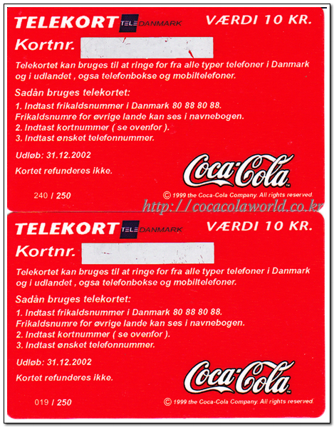 오늘은 먼저 소개해 드린 중국 차이나유니콤의 전지현 이미지의 코카-콜라 전화카드에 이어 두번째로 소개해 드리는 덴마크 TELEDANMARK사의 코카-콜라 이미지 전화카드입니다.