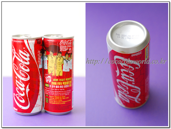 2006년 5월 8일자 제조 캔이고 대한민국 월드컵 대표팀 이미지와 태극기가 메인 비주얼로 사용되고 "대한민국 축구대표팀 공식후원사"라는 텍스트와 한국축구협회 엠블렘을 사용하였습니다. 코카-콜라 로고 아래로 축구 골 네트 이미지가 바탕에 사용된 걸 확인하실 수 있습니다.