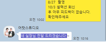 아직까지 수정 파일도 못 받았고 가타부타 피드백 한번 없네요. 전화도 잘 안 받습니다. 카톡 상담직원한테 확인 요청했더니.