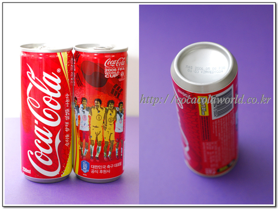 2006년 5월 8일자 제조 캔이고 대한민국 월드컵 대표팀 이미지와 태극기가 메인 비주얼로 사용되고 "대한민국 축구대표팀 공식후원사"라는 텍스트와 한국축구협회 엠블렘을 사용하였습니다. 코카-콜라 로고 아래로 축구 골 네트 이미지가 바탕에 사용된 걸 확인하실 수 있습니다.
