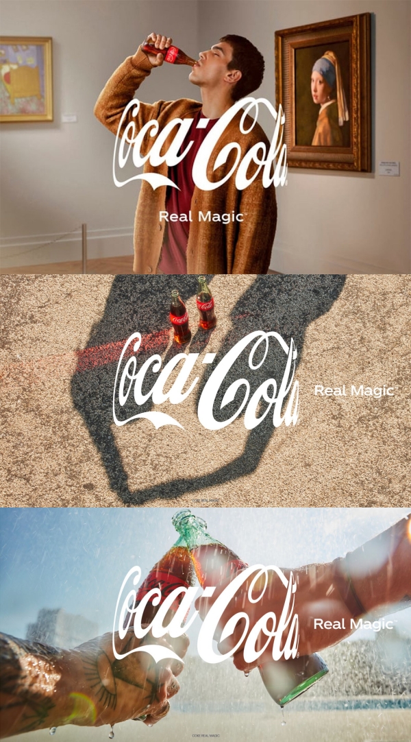 - 광고 특징: 사람과 사람이 만나고 소통하는 평범한 일상 속에 진짜 마법이 있다는 철학을 담았습니다. 혼자 마시는 콜라보다 '함께 공유하는 순간'의 가치를 강조하며, 단절되었던 시대를 지나 다시 연결되기를 바라는 시대정신을 반영했습니다. 수십 년간 평면적이었던 코카-콜라 로고에 변화를 주었습니다. 로고 양끝이 살짝 안으로 굽은 '허그 로고'는 코카-콜라 병의 곡선을 형상화함과 동시에 '따뜻한 포옹'을 상징합니다.